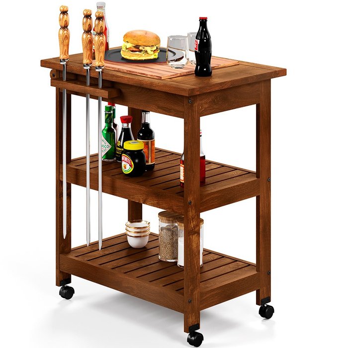 Fazer aquele churrasco de primeira é sem dúvida um dos melhores momentos para reunir família ou os amigos! Desta forma, ter um carrinho auxiliar de churrasco é super importante para servir refeições, acompanhamento ou bebidas com higiene e praticidade sem preocupações. Possui amplo espaço para armazenamento de acessórios ou condimentos em sua gaveta e suas prateleiras, suporte de espeto e suporte de talheres grandes. Sem abrir mão da beleza, o carrinho gourmet possui uma tábua de cortes móvel que o deixa ainda mais prático e contribui com a decoração da área de churrasco ou cozinha. Com ele a sua área gourmet está preparada para aquele final de semana!