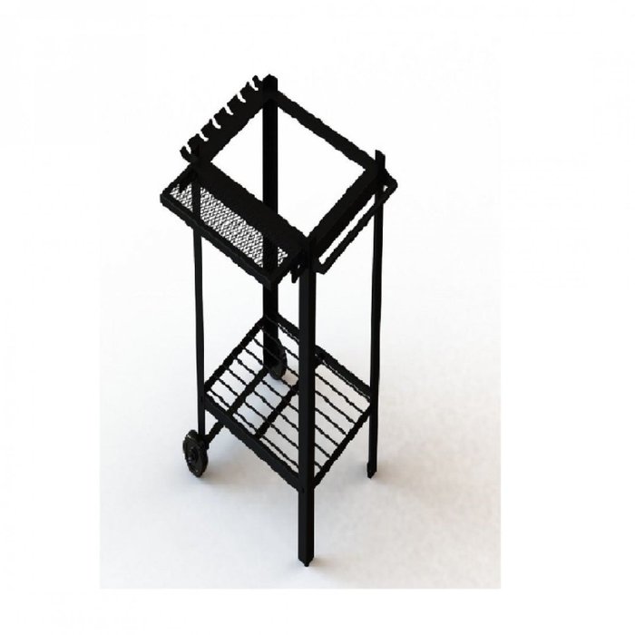 Rodízios que facilitam a mobilidade e grade de apoio para lenhas e carvão. Alça lateral para locomoção. Prateleira frontal e retrátil em tela expandida. Suporte auxiliar de pegadores e utensílios.