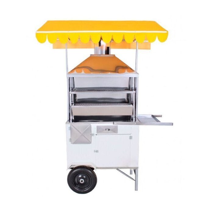 O Carrinho de Churrasco da R2 conta com caixa térmica, baú de mantimento, vitrine e gaveta de dinheiro além da sua churrasqueira inteira em aço inox de fácil limpeza. Esse Carrinho Ambulante possui estrutura de ferro para que não fique mole com o tempo de uso e 2 rodas com câmara para dar maior maciez no deslocamento do produto.
