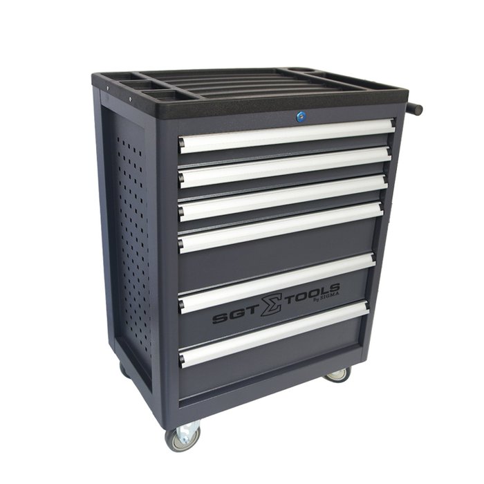 O Carrinho de Ferramentas com 6 Gavetas da SGT TOOLS é fabricado em chapa de aço resistente e inclui 4 rodas de metal giratórias, com 2 delas equipadas com freios para travamento. Os puxadores são feitos de alumínio, e as gavetas possuem corrediças telescópicas internas de alta resistência. Ideal para uso em segmentos automotivos, oficinas mecânicas, borracharias, estéticas automotivas e concessionárias, este carrinho oferece praticidade e organização para armazenar e transportar ferramentas de forma eficiente.