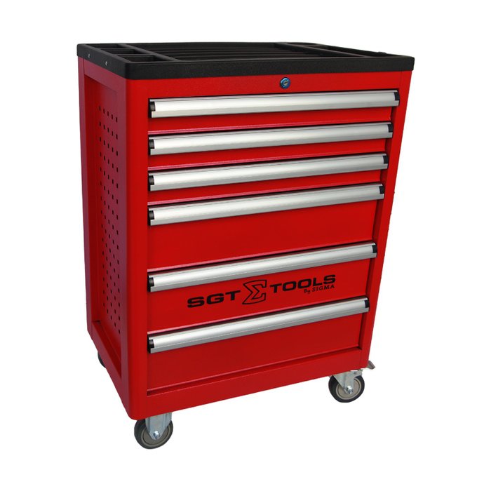 O Carrinho de Ferramentas com 6 Gavetas da SGT TOOLS é fabricado em chapa de aço resistente e inclui 4 rodas de metal giratórias, com 2 delas equipadas com freios para travamento. Os puxadores são feitos de alumínio, e as gavetas possuem corrediças telescópicas internas de alta resistência. Ideal para uso em segmentos automotivos, oficinas mecânicas, borracharias, estéticas automotivas e concessionárias, este carrinho oferece praticidade e organização para armazenar e transportar ferramentas de forma eficiente.