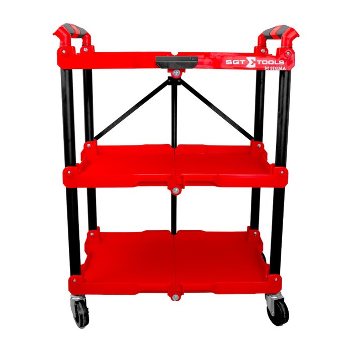 Carrinho prático e versátil, oferece três prateleiras espaçosas para organizar ferramentas. Com design dobrável e rodas giratórias, facilita o transporte e armazenamento em qualquer espaço.