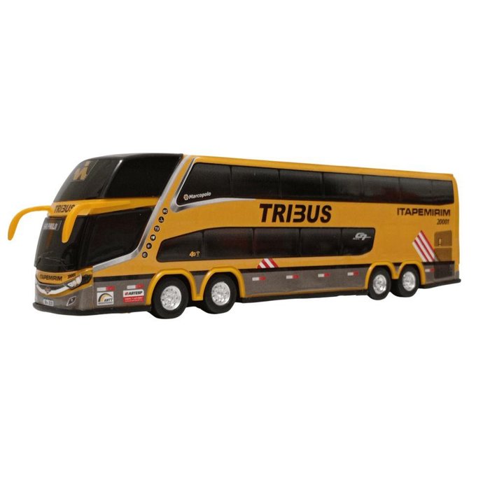 Carrinho ônibus Miniatura Tribus 1800 Dd G7Brinquedo Ônibus em miniatura 4 eixos dois andadores, super divertido e realístico.Possui um acabamento e adesivado de alta qualidade e resistência. Excelente para presentear, brincar, se divertir e colecionartamanho aproximado do ônibus: 30cm comprimento, 7cm largura e 9cm altura com escala 1/43..Especificações TécnicasFabricação:Nacional