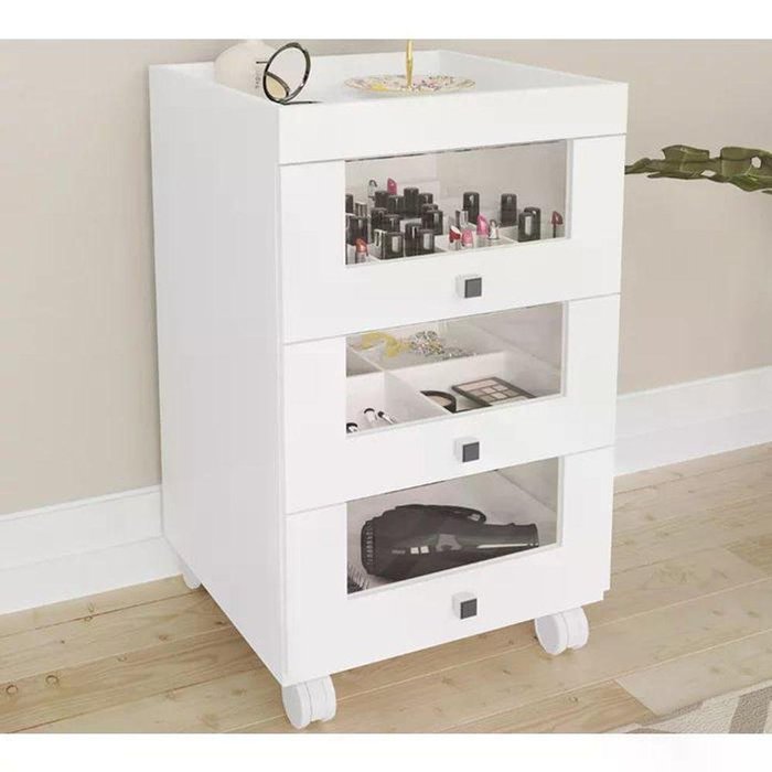 Carrinho Organizador De Maquiagem 3 Gavetas Pe2013 Branco Tecno Mobili Branco Carrinho Organizador de Maquiagem PE2013, perfeito para você organizar seus itens de maquiagem, perfumes, escovas e acessórios em um só lugar, estrutura resistente em MDP de 15mm, pintura com acabamento em Uv (Brilho). Conta com uma bandeja no topo da peça que deixa tudo mais a mão, são 03 gavetas com corrediças telescópicas com fechamento leve e suave, conta com divisores internos setorizados para organizar seus itens de forma super funcional, assim você terá muito mais praticidade ao escolher seu item, possui quatro rodizios que deslizam com facilidade, a frente das gavetas são de vidro tornando possivel enxergar oque você precisa com mais rapidez, puxadores são modernos e cromados, esta peça é ideal para seus acessórios de beleza mas você pode usar sua imaginação e usar no ambiemte que precisar. Este móvel chegará em sua casa separado em 01 volume.
