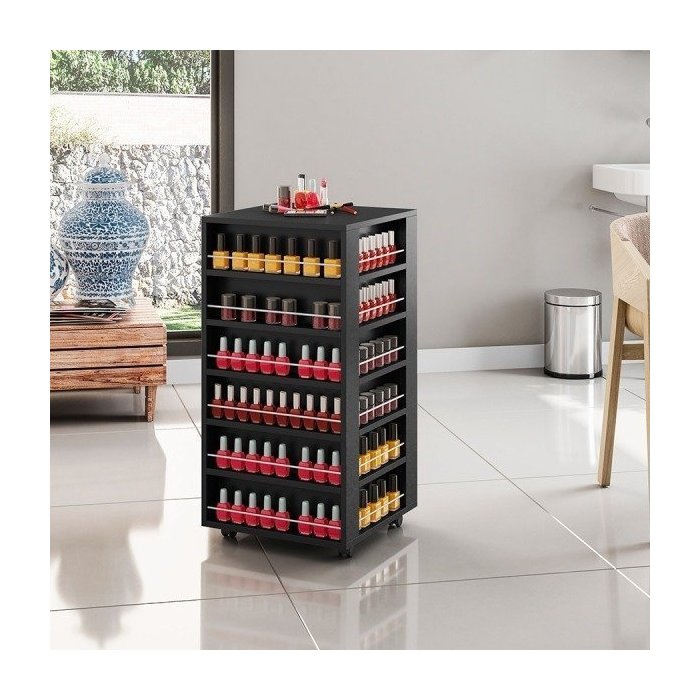 Porta Esmaltes Giratório Nicho Organizador Preto - 80x41x41cm Organize e decore seu salão de beleza ou sua casa, de forma muito mais prática e moderna com esse incrível e lindo nicho organizador de esmaltes feito em madeira MDP Preto. Além de lindo deixa seus esmaltes expostos de maneira simples e de fácil acesso! Contém 24 prateleiras e excelente acabamento e qualidade. Medidas Montado: 80 x 41 x 41cm. - Acompanha Kit de Instalação; - Haste de Plásticos e Material Reforçado; - Suporta até 300 Esmaltes de Porte Pequeno. O produto é enviado desmontado, sendo assim a montagem é por conta do comprador!O que estou comprando!, 01 - Porta Esmaltes Giratório Nicho Organizador Preto. *Imagens meramente ilustrativas.