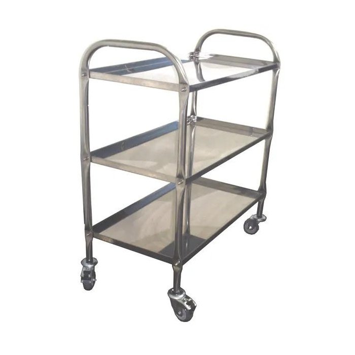 Carrinho em inox para servir café e chá com 3 bandejas / planos, 2 alças de movimentação tipo arco, guarnições tipo gradil em todos os planos, bandejas com abas de 25mm
