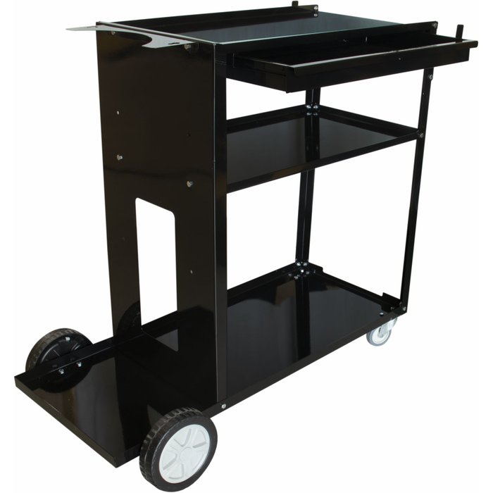 O carrinho tem um design compacto e prático, com rodas giratórias que permitem a movimentação fácil e segura. Ele possui duas prateleiras, uma na parte superior e outra na inferior, que podem ser utilizadas para acomodar equipamentos e materiais de solda.