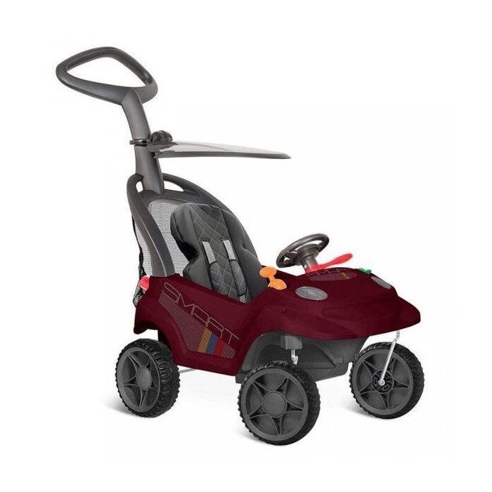 O carro de passeio mais completo da categoria com diversas funções! O smart é seguro, confortável, inteligente e que permite a utilização do adulto e a diversão da criança. Função passeio: o adulto conduz o smart como um carro de passeio. Função passo a passo:recuando o assoalho, a criança impulsiona o smart com os pés, para qualquer direção. Função primeiros passos: com a supervisão de um adulto o smart permite que a criança segure a haste e estimule o equilíbrio e a coordenação motora nos primeiros passos.