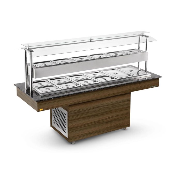 Utilizado para conservar qualquer tipo de alimento, possui sistema de aquecimento de banho maria (alimento bem aquecido sem queimar), acabamento em granito e fórmica, além de ser facilmente deslocavel com seus rodízios com travas; Estrutura confeccionada em aço inox e com iluminação flourescente.