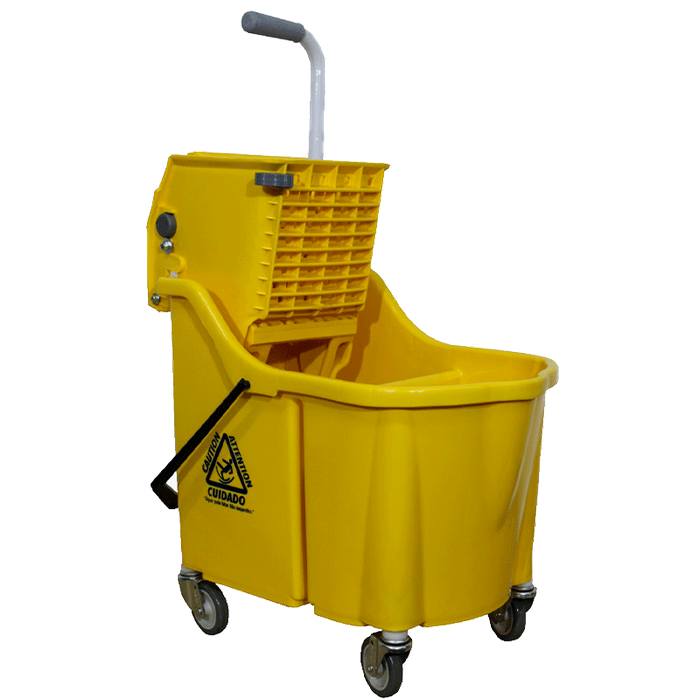 Balde Espremedor Certec composto por um balde plástico com capacidade de 33 litros, divisória não removível, dreno, rodas, e um espremedor de pressão horizontal.