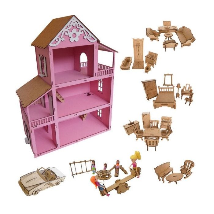 Casa Casinha Polly Pocket Pintada com 27 Móveis ,1 Parque e 1Carro em MDF Cru