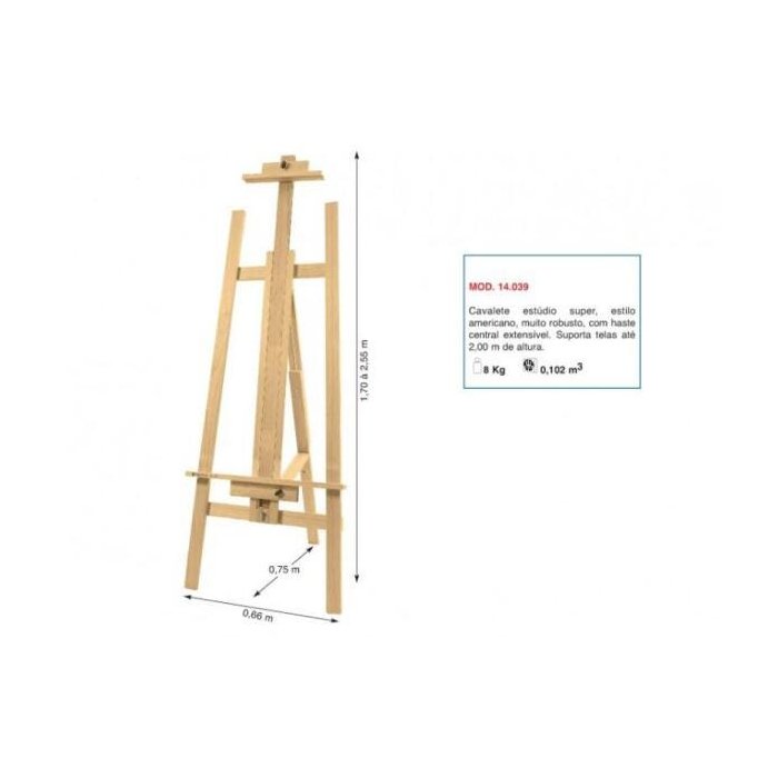 cavalete para pintura até 2,00m pinus trident 14.039.cavalete estúdio, super, estilo americano muito robusto, com haste central extensível. suporta telas de até 2,00m de altura
