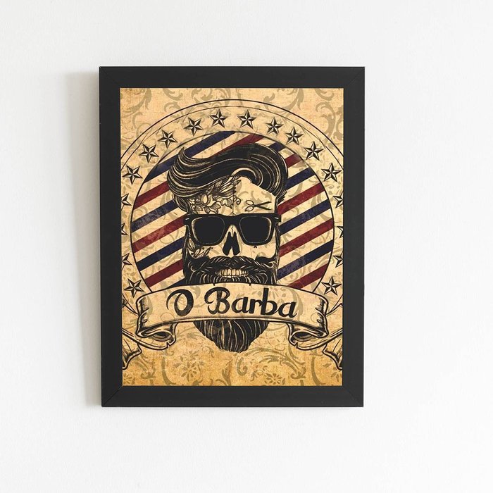 Caveira Barbearia Vintage Quadro Moldura Preta 60x40cm