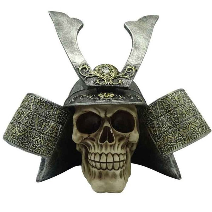 Caveira Resina Capacete Samurai Prata Cinza
