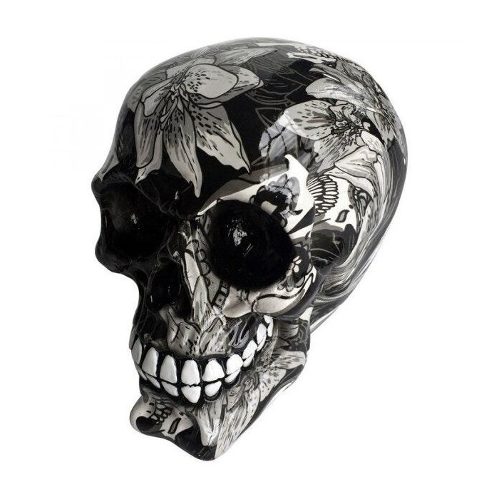 Caveira Resina Flowers Tattoo 14,5cmx10cmx15,5cm Branco/Preto
