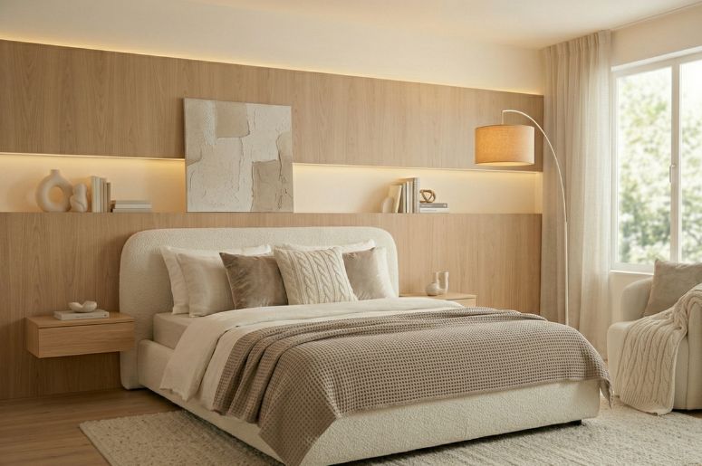 - Revestimentos: cimento queimado claro ou painéis com textura valorizam o tom