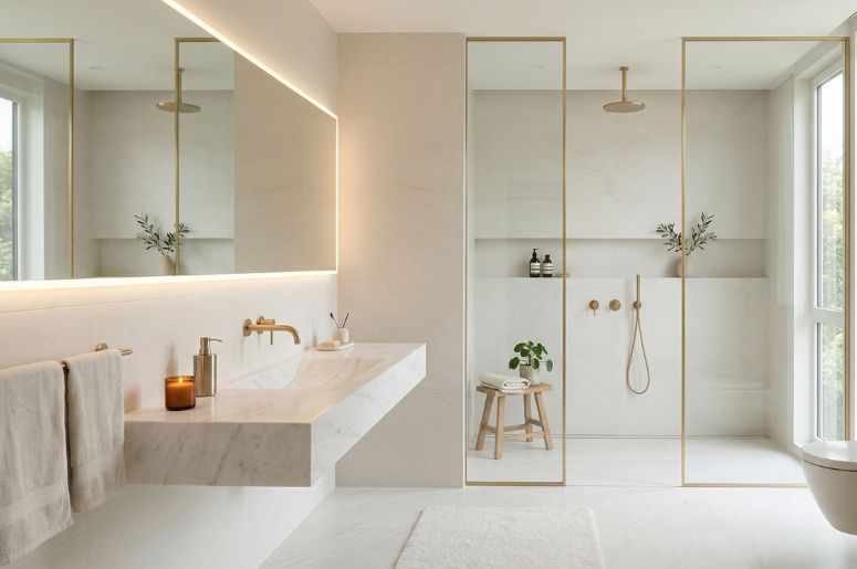 No banheiro, o off-white é uma escolha muito inteligente. Além de ampliar visualmente o espaço, transmite limpeza e sofisticação. Aposte em: