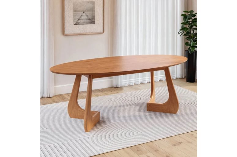 Móveis com linhas orgânicas, como mesas de jantar ovais, mesas de apoio redondas, espelhos curvos e tapetes em formatos irregulares, são destaque. Essa estética reforça a fluidez e a naturalidade no ambiente, unindo beleza e leveza.