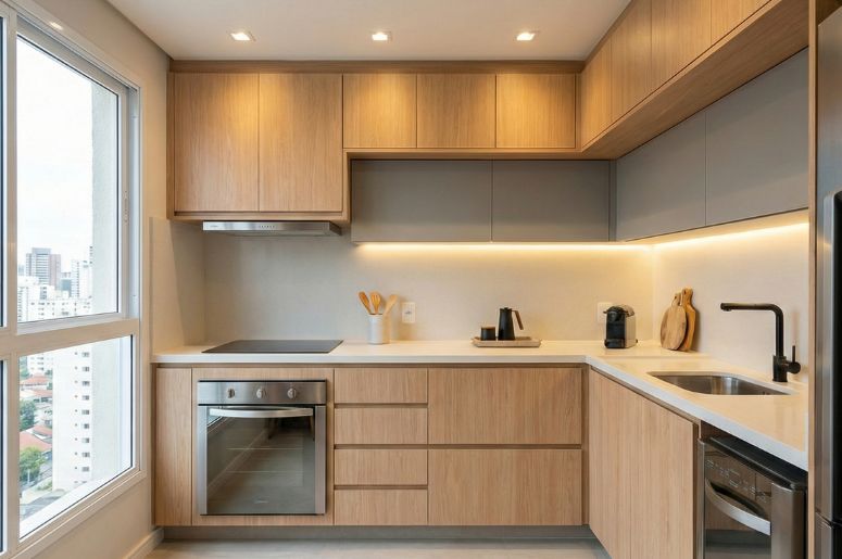 Em ambientes compactos, o estilo moderno funciona melhor quando bem planejado. Algumas soluções eficazes incluem:
