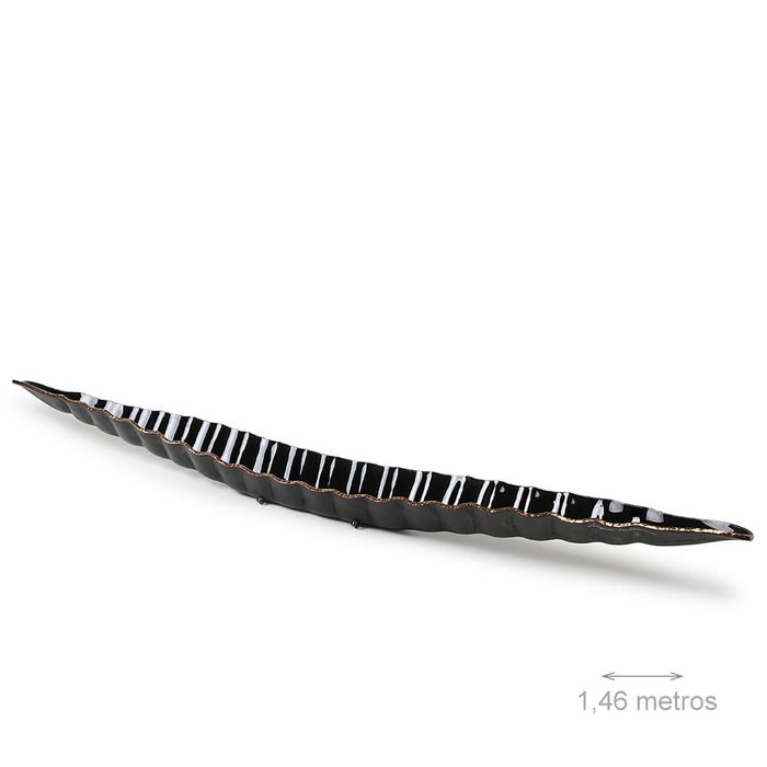 Centro de Mesa Fava 1,46 metros Preto com Borda Dourada. O efeito desta peça com desenho assinado pela artista plástica Regina Medeiros é produzido através do processo de fusing em que uma chapa de vidro é cortada e recebe a pintura à mão com esmaltes a base de metais e óxidos minerais. Depois de preparado cuidadosamente o vidro é aquecido a mais de 700ºC para que a pintura se funda com o vidro e para que o vidro adquira suas curvas e formas. Por ser uma peça artística e executada manualmente podem ocorrer pequenas variações em suas características de desenho e distribuição das cores em relação à imagem.