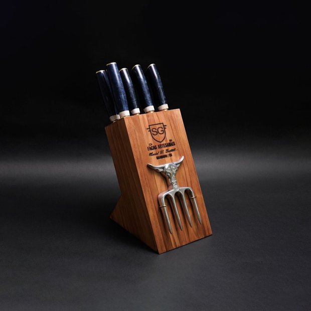 Especificações:• Faca: Tamanhos 6”, 8” e 10” polegadas• Chaira: 10” polegadas• Garfo: 10” polegadas• Garfo Bad Bull: Estrutura reforçada para cortes e fixação de peças grandes• Espessura das peças: 3 mm• Material: Aço inoxidável 420C (55 HRC)• Cabo: Resina com detalhe em chifre de cervo, acabamento artesanal• Produção artesanal nacional