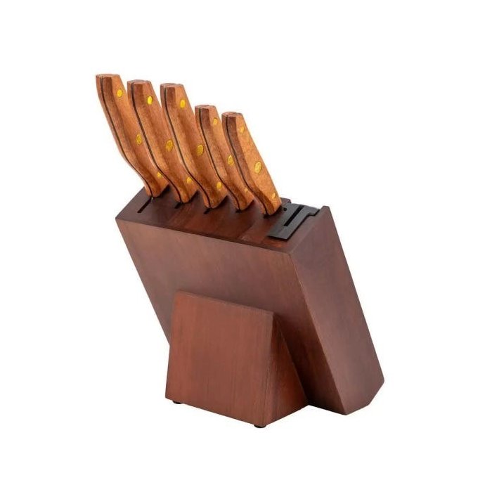 Cepo com revestimento em madeira e afiação e 05 Facas lâminas Inox Preta e cabo madeira