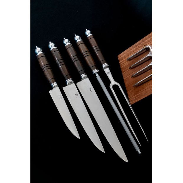 Este conjunto reúne facas, garfos e chaira de alta qualidade, armazenados em um imponente cepo de madeira, ideal para organização e fácil acesso durante o preparo. Perfeito para chefs profissionais, churrasqueiros e amantes da gastronomia.