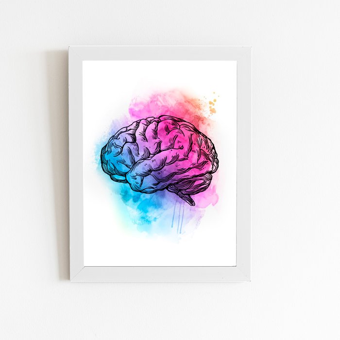Cérebro Colorido Azul e Rosa Quadro Moldura Branca 60x40cm