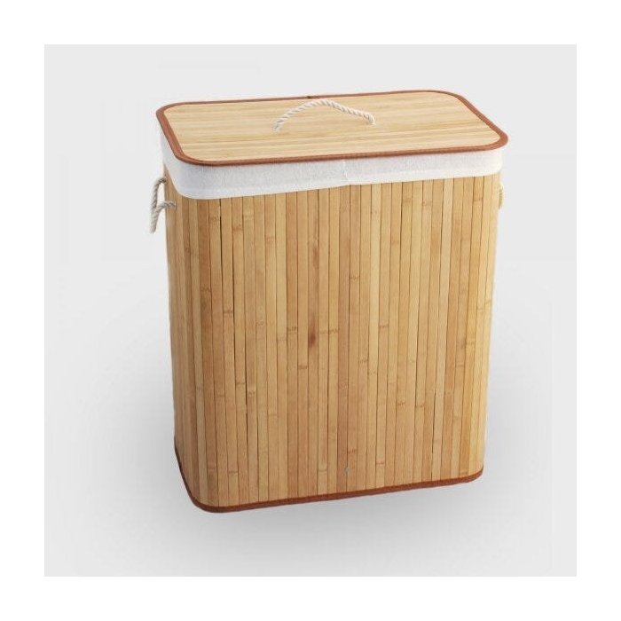 Cesto fabricado com bambu natural, tramado e costurado a mão; saco interno removível, 100% de algodão; tampa com alça e alças laterais para auxilio no deslocamento. Ideal para sua lavanderia ou banheiro.