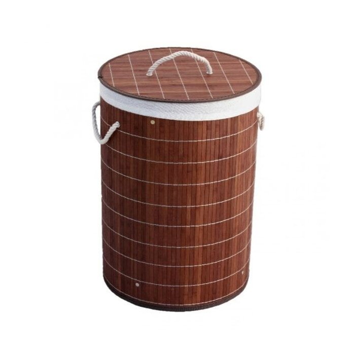 Cesto fabricado com bambu natural, tramado e costurado a mão; saco interno removivel e 100% de algodão; tampa com alça e alças laterais para auxilio no deslocamento. Ideal para sua lavanderia ou banheiro.