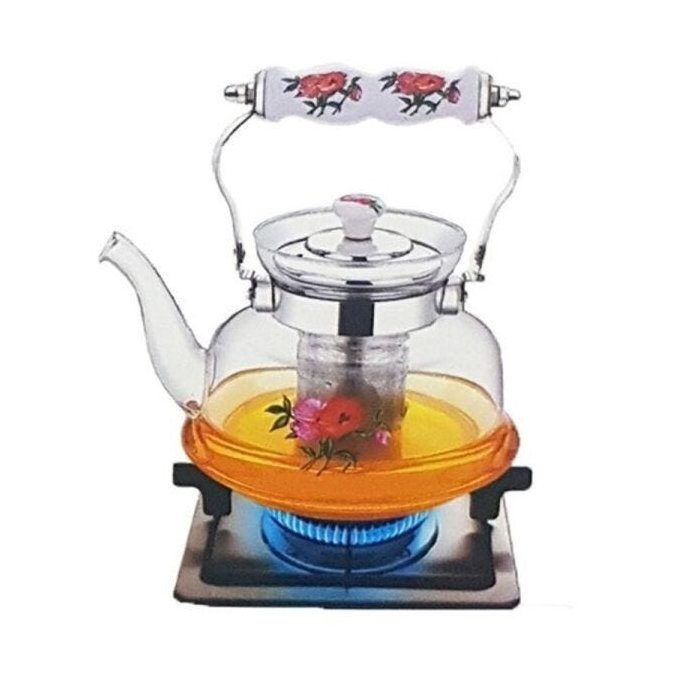 Chaleira com infusor de chá feita de vidro, possuí alça inox, capacidade de 1L e o melhor pode ir direto ao fogo.