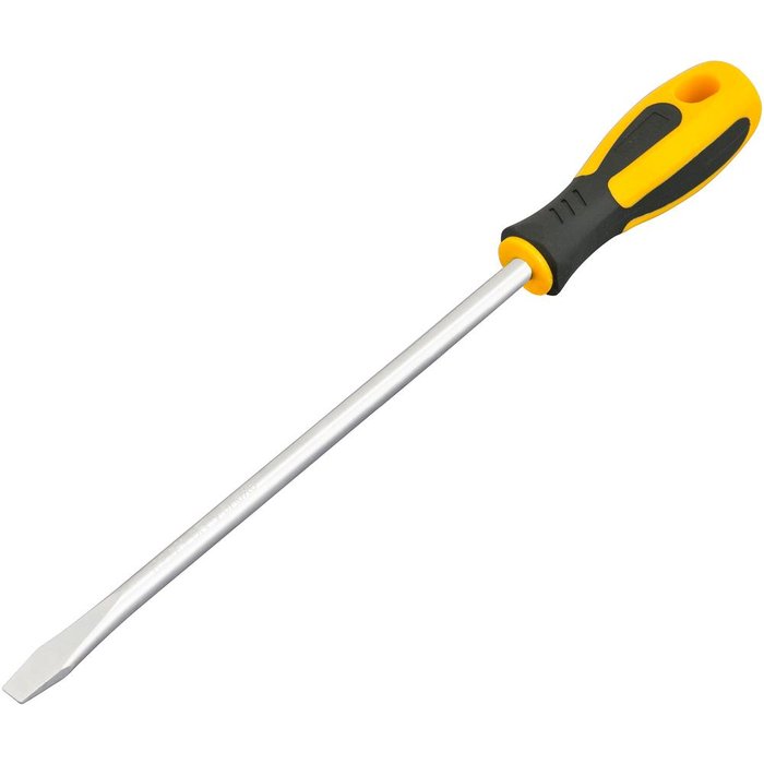 Largura da ponta da chave: 5/16" - 7,9 mm Comprimento da haste da chave: 8" - 203 mm Material da haste da chave: Aço cromo vanádio Acabamento da haste da chave: Niquelado Material do cabo da chave: Polipropileno revestido com borracha termoplástica Cor do cabo da chave: Preto e amarelo