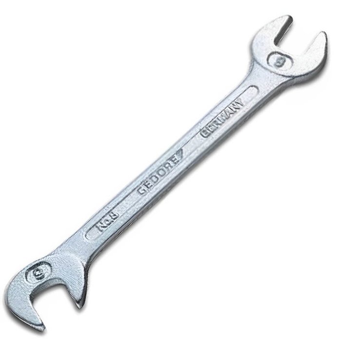- Aço Gedore-Vanadium. Acabamento niquelado e cromado, e cabeças polidas. Duas extremidades de mesma medida. Inclinação das bocas em relação a haste: um lado 15º e o outro 75º. De grande versatilidade para serviços na eletrônica, como montagem e desmontagem de painéis