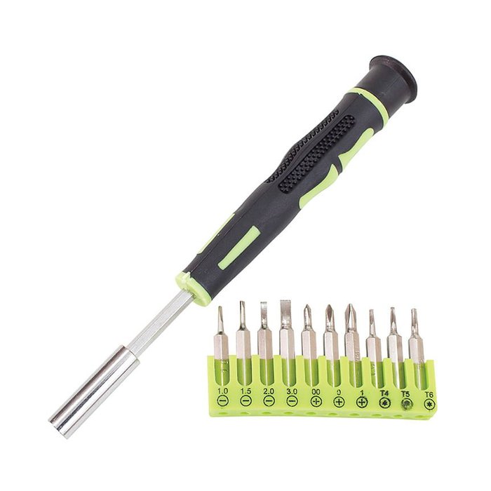 JOGO CHAVES DE PRECISÃO - Dimensões da Peça: - 1 Cabo: 15 x 1,8 x 1,8cm - Pontas: 2,4 x 0,4 x 0,4cm - Dimensões da Embalagem: 9,5 x 2,5 x 22cm - Quantidade Inner: 12 Peças - Dimensões Inner: 22,5 x 11 x 18cm - Quantidade Master: 120 Peças - Dimensões Master: 58 x 25 x 38cm - Material: Aço 45, PP, PVC - Cor: Cabo preto com verde - Tipo de Embalagem: Blister - Marca: Western - Origem: China - 10 Pontas Intercambiáveis. - Encaixe Imantado. - Jogo contendo: 10 Pontas - 1 Cabo - Tamanho: - Fenda: 1,0 - 1,5 - 20 - 3,0mm - Torx: T4 - T5 - T6 - Phillips: PH00 - PH0 - PH1 - Para: - Celulares. - Aparelhos eletrônicos. - Reparos em geral. - Cuidados: - Não utilize em aparelhos energizado. Ferramenta não isolada. - Para reduzir o risco de lesões, sempre use adequadamente equipamentos de proteção individual (óculos de proteção, Máscara, protetor auricular, luvas, botas, etc...). Necessário ao trabalho. - Use a ferramenta correta para cada tipo de trabalho. Não f
