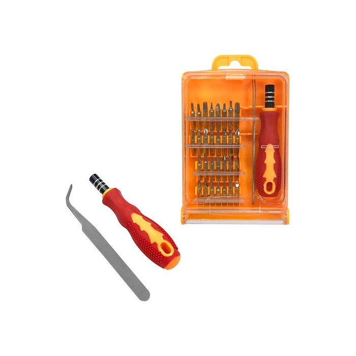 CHAVE PRECISÃO 32 PEÇAS - Dimensões da Peça: - Pontas: 2,7 x 0,3 x 0,3cm - Pinça: 11 x 1,8 x 0,1cm - Cabo: 9,5 x 2,2 x 2,4cm - Estojo: 8,5 x 14 x 3cm - Dimensões da Embalagem: 11,5 x 3,5 x 20cm - Quantidade Master: 48 Peças - Dimensões Master: 45 x 35 x 23cm - Material: Aço carbono, PVC, PP e PS. - Cor: Estojo Laranja / Cabo Vermelho / Pontas Aço - Tipo de Embalagem: Blister - Marca:Western - Origem: China - Contém: - 1 Pinça, 1 Cabo, 1 Estojo, 29 pontas: - 6 Fenda: 1,5-2,0-2,5-3,0-3,5-4,0mm - 9 Torx: T4,T5,T6,T7,T8,T9,T10,T15,T20mm - 5 Philips: PH1,PH2,PH0,PH00,PH000 - 5 Allen: H1,5 - H2 - H2,5 - H3 - H4 - 1 Tri-Wing: Y3,0MM - 1 Fenda triangulo/ Triangular: 3,0mm - 1 Estrela/ Five star: 2,0mm - 1 Fenda de pino: 1,0mm - Para uso em celulares, computadores, tablets, camera digital, relógio, etc - Cuidados: - Utilize equipamentos de proteção individual ( óculos de proteção, botas, etc.) necessários ao trabalho. - Use a ferramenta correta para sua aplica