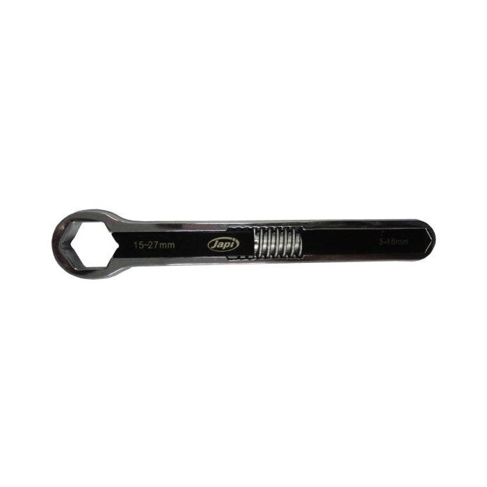 Aço cromo vanádio. Funciona em medidas que variam de 3 a 27 mm. Um lado funciona de 3 a 15 mm e o outro de 15 a 27 mm. Substitui um jogo de chave de boca. Ajustável para atender milímetros e polegadas. Funciona no menor parafuso sextavado encontrado no mercado. O ajuste é feito através de um mecanismo de giro que se localiza no meio da ferramenta.