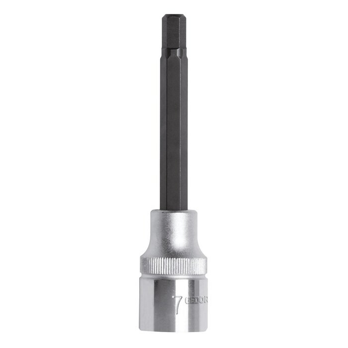 Chave soquete 1/2″ hexagonal longa, 8mm Chave soquete perfil hexagonal longo, utilizada com acessórios e catracas para aperto e desaperto de parafusos.Para ferramentas de uso manual