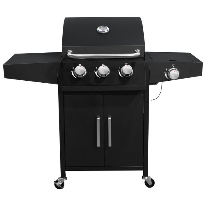 SOBRE O PRODUTO Churrasqueira a gás com três queimadores centrais totalmente individuais e queimador lateral. Possui sistema PIEZOnão utiliza pilhas ou eletricidade. Produto práticosem emissão de fumaça em grande volumefácil de limpar e de realizar manutenção. Tem grelhas em aço inoxidável. Possui uma prateleira de aço inoxidável ao lado esquerdooferecendo amplo espaço na preparação dos alimentos. Com termômetro e alça na tampa e compartilhamento inferior para armazenar acessórios (internamente suporta até 30KG). ATENÇÃO Não acompanha kit de gás e nem botijão de gás. DADOS TÉCNICOS Material Aço Superfície revestida para alta temperatura Grelha de cozinha Diâm. 4mm cromado Potência 11 6 / 10000BTU cada Combustível A gás Cor Preta Queimador principal 8 7KW (3 X 2 9KW) Queimador lateral 2 9 KW Material das grelhas Aço inoxidável