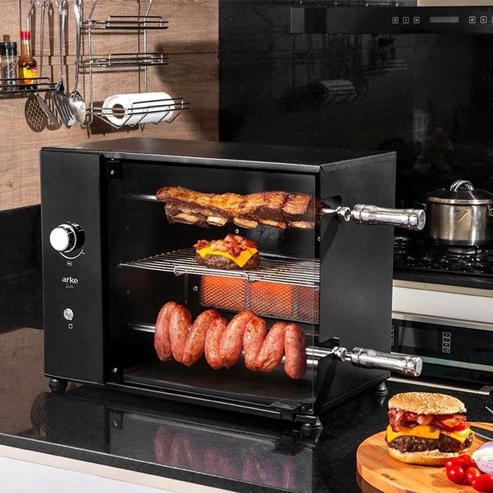 Churrasqueira A Gás GLP Rotativa Elétrica 2 Espetos + Grelha Acendimento Manual Duetto 220V ArkeA Churrasqueira Assador Rotativo Elétrico a Gás GLP Duetto é uma ótima opção para momentos descontraídos com a família ou grupo de amigos. Ela possui um sistema de rotação de espetos que permite assar de forma homogênea todos os tipos de carnes. Seu queimador infravermelho proporciona um sabor ainda mais especial aos alimentos. Com pés antiderrapantes, garante segurança e estabilidade durante o uso, além de ser produzida em aço carbono com pintura epóxi, o que aumenta a durabilidade e facilita a limpeza.Além disso, possui uma grelha em aço inox AISI 304, ideal para grelhar carnes, legumes e outros alimentos. O design funcional conta com um painel de vidro e botão de LED, oferecendo maior elegância e sofisticação.Características:Produzido em Aço Carbono