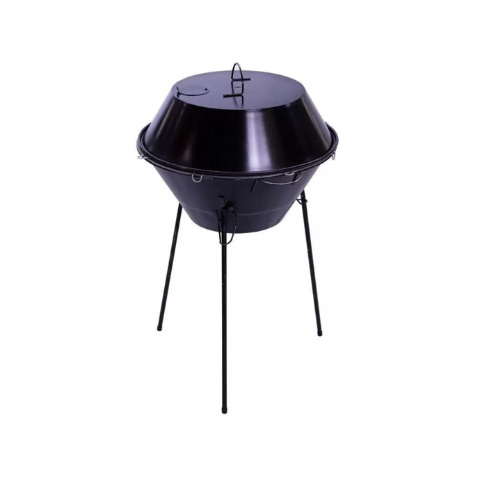 Chapa galvanizada - Espessura 0,8mm/nFundo e tampa sem solda - Inteiriço/nGrelha reforçada - Arame 2,76mm/nPrato para carvão/nTampa com chaminé/nDiâmetro 52cm/nAltura (tampa aberta) - 68cm/nAltura (tampa fechada) - 82cm