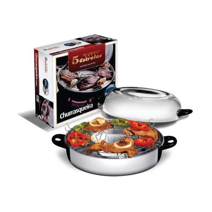 - Churrasqueira para fogão: Saudável, não retém gordura - A tampa serve para usar como saladeira - Fácil de utilizar, limpar e guardar (desmontável) - Para assar, grelhar e aquecer - Excelente para quem mora em apartamento DADOS TÉCNICOS - Tamanho: 32cm de diâmetro x 10cm de altura - Material: Baquelite, alumínio polido e aço - Itens inclusos na embalagem: Churrasqueira com 2 alças laterais, tampa com 2 alças laterais e grelha APLICAÇÕES - Apartamento - Residência - Praia - Campo ESPECIFICAÇÕES: Fornecedor: 5 Estrelas Medida do produto: 40x32x10 cm (LxCxA) Peso do produto: 1920 gramas Medida da embalagem: 45x40x15 cm (LxCxA) Peso da embalagem: 2370 gramas Referência: 072 EAN: 7897022200722 Código: 25357