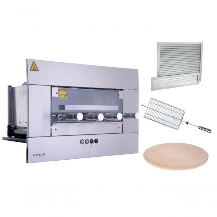 Churrasqueira Elétrica de Embutir 4 Espetos Titan 220V + Espeto Grelha + Pedra de Pizza A Churrasqueira Elétrica Titan para embutir em nicho de alvenaria, complementa o seu espaço gourmet e deixa o ambiente mais moderno e prático. É ideal para assar carnes, legumes e pizza e garante um churrasco perfeito. Possui sistema rotativo, iluminação interna, queimadores infravermelhos e regulagem e controle de temperatura. A churrasqueira silenciosa e não produz fumaça. Acompanha kit de venezianas de ar. Itens Inclusos no Conjunto- 1 Churrasqueira Elétrica de Embutir 4 Espetos Titan 220V- 1 Espeto Grelha- 1 Pedra de Pizza Informação Técnicas- Função: Assar carnes, peixes, legumes e pizzas- Capacidade total de carnes: 6,8 kg- Cada espeto suporta 1,7 kg de carne- Número de espetos: 4- Giro do espeto: 6RPM- Tensão do Motorredutor Elétrico: 12v- Potência do Motorredutor elétrico: 28W- Número de queimadores: 2 un- Controlador de queimador individual- Tensão: 220v- Frequência: 60Hz- Lâmpada: Halopin G9, 220v, 40W- Consumo elétrico 2,6 Kw/h- Acendedor automático Composição- Gabinete externo frontal modular em aço inox AISI 304 escovado- Bandeja coletora de gordura com frente em inox- Grade interna de apoio- Porta frontal de vidro temperado com sistema telescópico- 04 Espetos rotativos com cabo térmico – Sendo 03 simples e 01 triplo Medidas da Churrasqueira- Medidas produto (A x L x P): 48,7 x 70,3 x 56,5 cm- Medidas da embalagem (A x L x P): 58 x 64 x 73 cm- Peso Líquido: 18 kg Característica e Medidas da Veneziana- Função: Fluxo de ar no nicho padrão Titan 4 espetos- Fixação: com molas de pressão ou parafuso e bucha- Palhetas Fixas- Material: Em Alumínio- Cor padrão: Alumínio Anodizado- Dimensão Veneziana Superior: 56 cm (largura) x 12 cm (altura)- Dimensão Veneziana Inferior: 56 cm (largura) x 50 cm (altura)- Medidas embalagem (A x L x P): 20 x 65 x 63 cm- Peso: 2,8kg Características e Medidas do Espeto Grelha