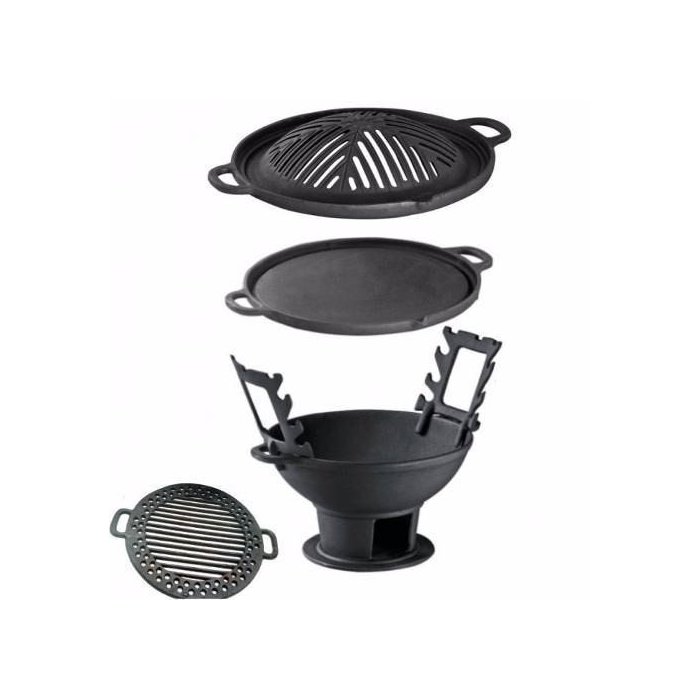 Gengiskan redonda em ferro fundido completa(chapa lisa, chapa inclinada, chapa grelha, suporte espeto, base e ralo).