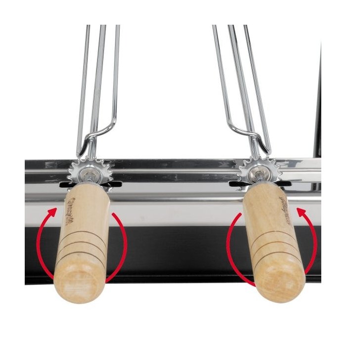 A Churrasqueira Giragrill Garden 2300, conta com 5 espetos giratórios em aço cromado com cabos de madeira marfim,acionados por motor elétrico bivolt, acabamento em aço com pintura eletrostática, peças cromandas e calha em inox, 2 mesas de serviço retráteis.Detalhes Exclusivos: