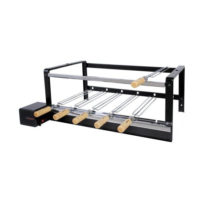 Suporte para churrasqueiras de alvenaria, com 6 espetos que giram em rotação constante, acionados por motor elétrico bivolt. Detalhes exclusivos com registro de patentes: 1 – ROTAÇÃO CRUZADA (os espetos giram em sentidos opostos) para evitar interferência de um espeto e outro. 2 – Apoio de espeto superior MULTIPONTO com 17 posições diferentes para girar os espetos. 3 – Armação do Kit em forma de PÓRTICO para evitar sua exposição direta sobre calor da brasa (modelos sem este recurso, têm vida útil mais curta). Tudo em aço, com pintura eletrostática. 4 – Espetos cromados com cabos em MADEIRA MARFIM. PARA USO EXCLUSIVAMENTE RESIDENCIAL. DISPONÍVEL TAMBÉM COM O MOTOR NO LADO DIREITO. ITENS INCLUSOS • 6 Espetos Tridente ET-510 CARACTERÍSTICAS Material: Estrutura em aço reforçado, com pintura eletrostática Capacidade: 18 a 30 pessoas Voltagem: Bivolt Peso Líquido: 7,55 kg Peso Bruto: 8,45 kg Medidas do Produto: C 82,2 x A 32,5 x P 58,0 cm Medida Ideal do Braseiro: C 75,0 x L 39,0 P 22,0 cm Medidas da Embalagem: C 86,5 x A 11,5 L 22,5 cm Todas as garantias são dadas pelos fabricantes, e variam de produto para produto. Elas serão informadas nas páginas de cada produto. Caso tenha alguma dúvida, entre em contato conosco. Para devoluções, os produtos deverão ser remetidos em suas embalagens originais e caso for constatado mal uso, o custo será por parte do comprador.