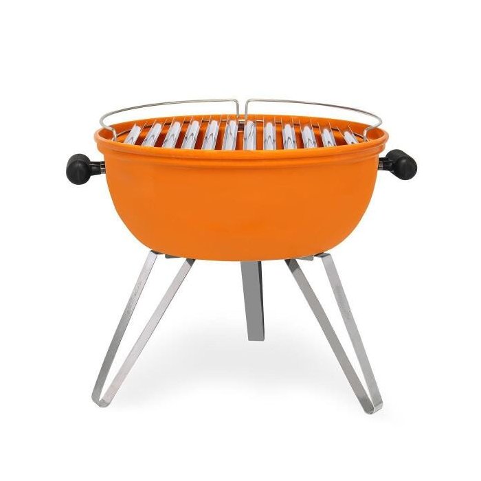 Corpo em alumínio pintado de laranja, grelha e tripé em inox. Grelhados para 8 pessoas!