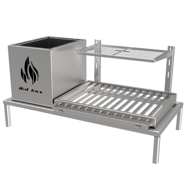 Nossas Parrillas possuem uma caixa de fogo, que chamamos de FIREBOX, onde é realizado a queima do carvão ou lenha. Conforme vai formando o braseiro, as brasas vão caindo na base refratária da sua churrasqueira, e o assador arrasta essa brasa viva para baixo das grelhas, tendo assim um maior controle de temperatura no corte que está sendo grelhado.