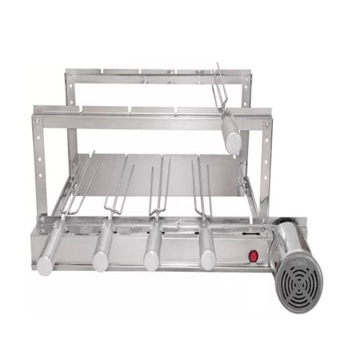 Novo modelo Toda em Inox com 5 Espetos com Cabos de Alumínio que não Queimam as Mãos Oferecendo mais Conforto e Comodidade E Equipada com Motor WEG Bivolts O Melhor Motor do Mercado Atende as Necessidades de até 40 Pessoas para um Churrasco Com Base giratória Inferior e Superior para Espetos Dimensões: Largura: 60cm + 10cm do motor que fica externo Profundidade: 45cm Altura: 31cm Peso Bruto: 8 Kg Motor: 1/3 cv Voltagem: Bivolt