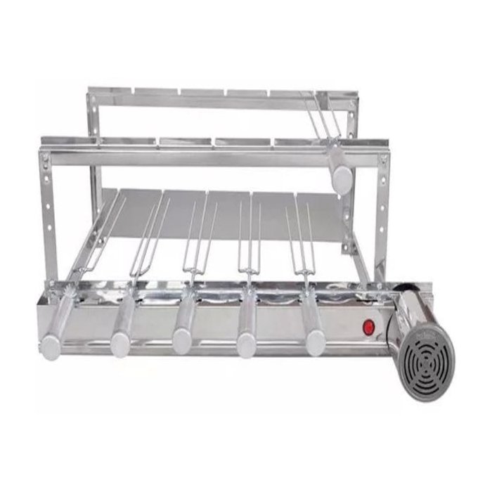 Novo modelo Toda em Inox com 6 Espetos com Cabos de Alumínio que não Queimam as Mãos Oferecendo mais Conforto e Comodidade E Equipada com Motor WEG Bivolts O Melhor Motor do Mercado Atende as Necessidades de até 40 Pessoas para um Churrasco Com Base giratória Inferior e Superior para Espetos Dimensões: Largura: 71,5cmcm + 10cm do motor que fica externo Profundidade: 45cm Altura: 31cm Peso Bruto: 8 Kg Motor: 1/3 cv Voltagem: Bivolt Voltagem: Bivolt A Churrasqueira Giratória Grill Inox 5 Espetos Seve Fort.