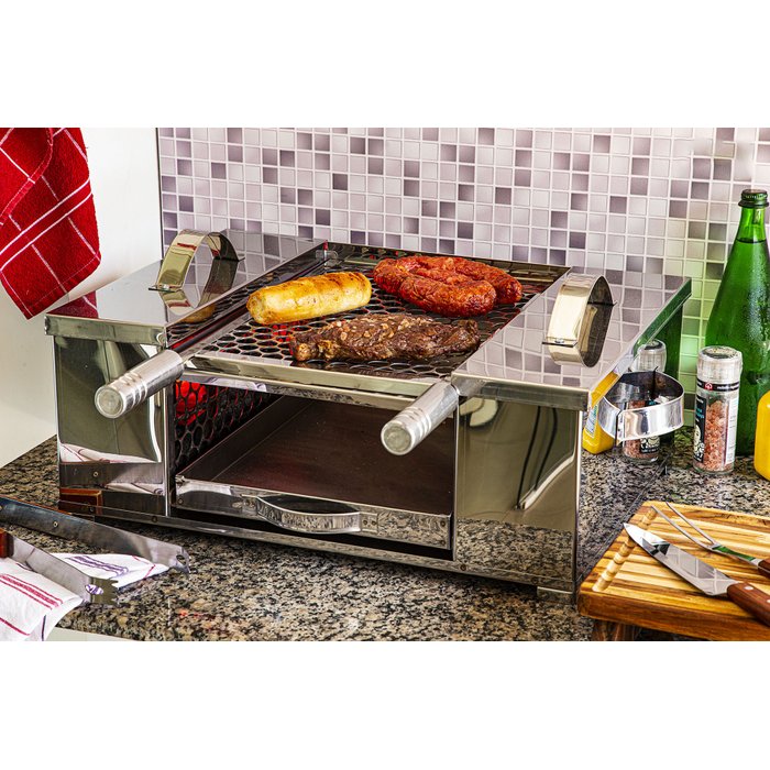 Praticidade total e ótima qualidade, robusta, brilhante e fácil de transportar. Recipentes laterais para carvão evitando fumaça e facilitando na limpeza do mesmo, e melhor dissipação do calor e proporcionar um preparo mais controlado e objtetivo na grelha. Totalmente feita em aço inoxidável, resistente a ferrugem e 100% ecológica!